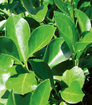 Glossy leathery dark-green serrated leaves |
